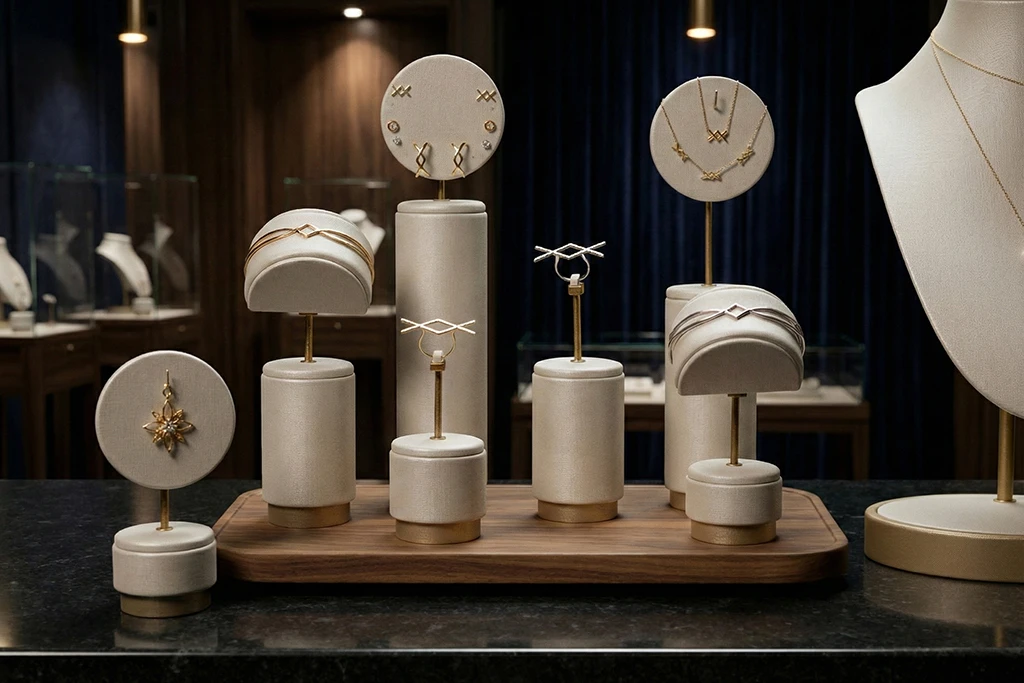 A solução dos materiais foscos e texturizados: Para vender joias de alto padrão, o ideal é utilizar materiais que absorvam a luz, como Couro Sintético (Courino), Camurça ou madeiras nobres como a Muiracatiara. Ao usar um busto revestido em camurça de tom neutro (nude, off-white ou cinza), o material absorve a incidência da luz LED, permitindo que o brilho venha apenas do metal e da pedra da joia.